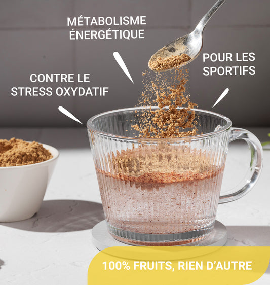 Qui permet de booster votre alimentation en vitamines, minéraux et fibres. Une cuillère à soupe équivaut jusqu'à 120g de produit frais soit plus d'une portion!
