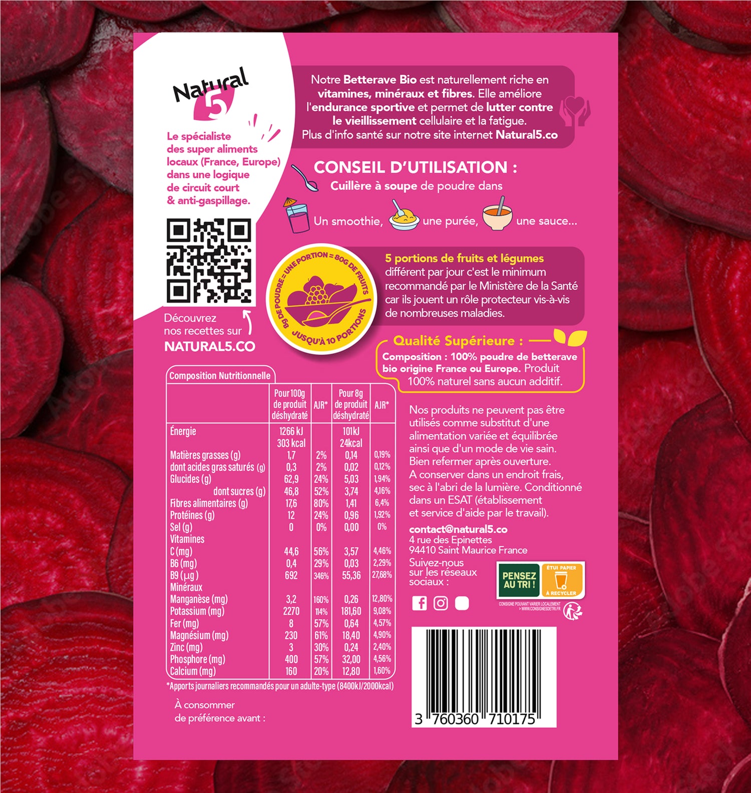 Explorez en détail les ingrédients naturels qui composent notre Betterave Poudre Bio 50g.