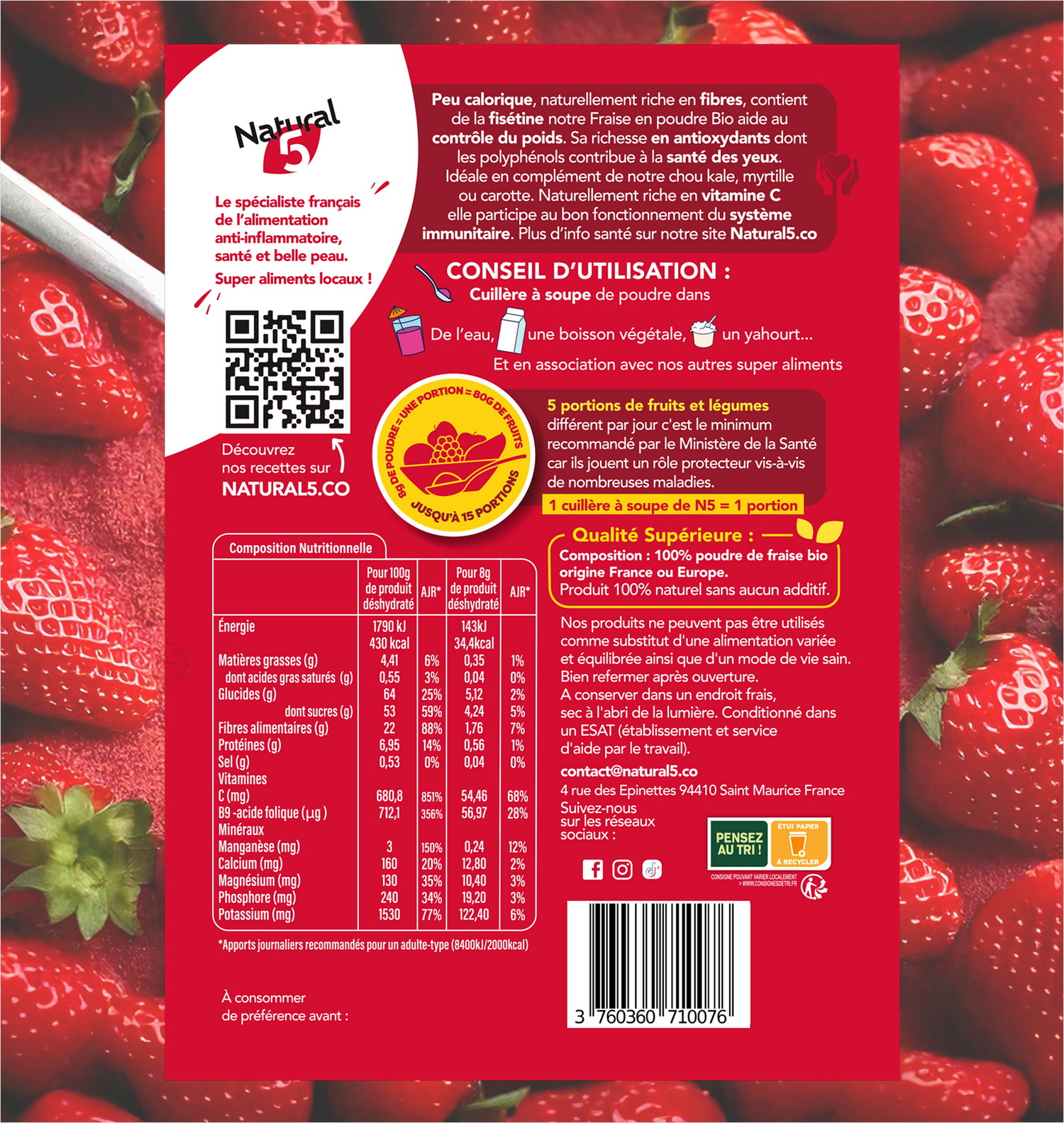 Explorez en détail les ingrédients naturels qui composent notre Fraise Poudre Bio 120g.
