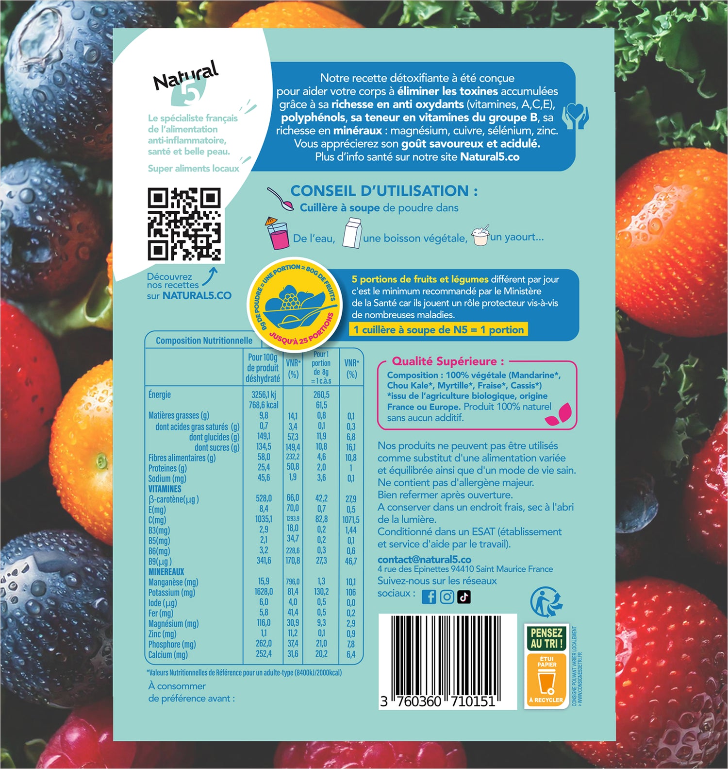 Composition : Mandarine Bio, Chou Kale Bio, Myrtille Bio, Fraise Bio, Cassis Bio. . Adapté à l’alimentation: vegan, sans lactose, sans gluten.